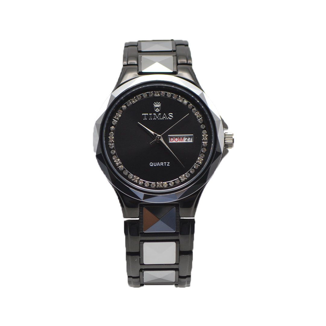 This timepiece is a bold statement of uncompromising luxury and style for men. The Timas All-Gold Watch commands attention with its polished finish, crystal-studded bezel, and rich black dial featuring a functional Day/Date display. Built for lasting quality, it includes a durable Chain Bracelet, a Scratch-Proof Sapphire Crystal, and a reliable Japan Quartz Movement.