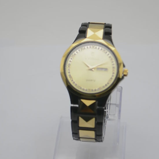 This timepiece is a bold statement of uncompromising luxury and style for men. The Timas All-Gold Watch commands attention with its polished finish, crystal-studded bezel, and rich black dial featuring a functional Day/Date display. Built for lasting quality, it includes a durable Chain Bracelet, a Scratch-Proof Sapphire Crystal, and a reliable Japan Quartz Movement.